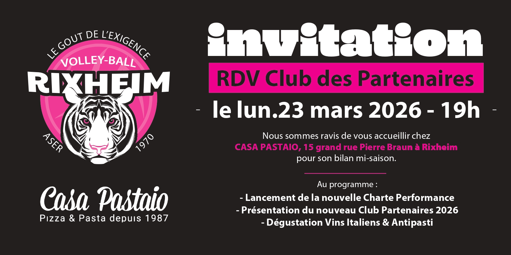 Le RDV Club des Partenaires se tiendra le lundi 23 mars 2026 à 19h, chez Casa Pastaio à Rixheim.